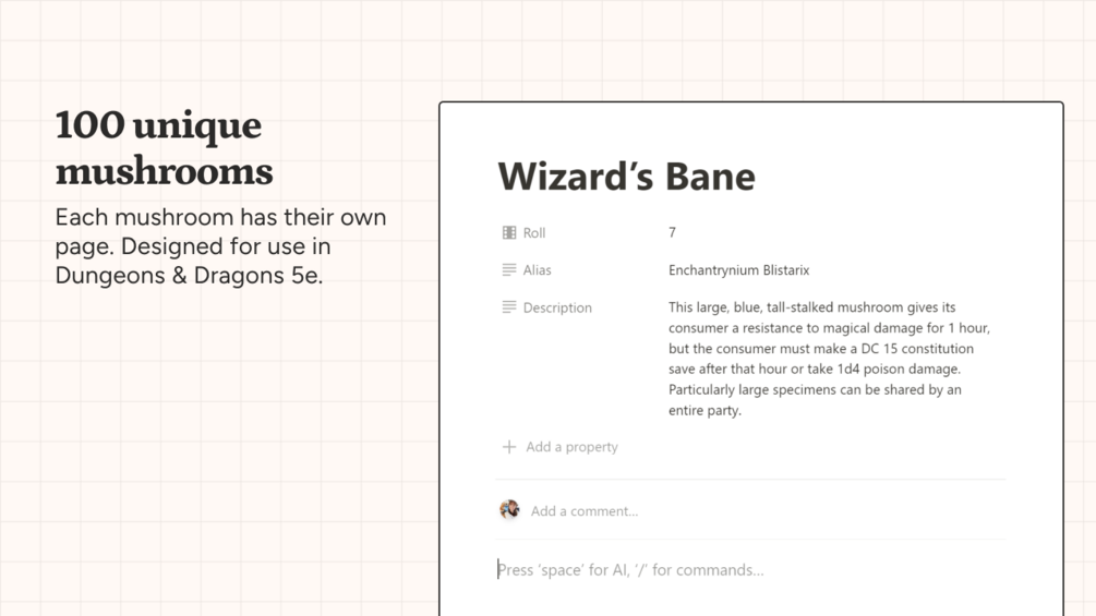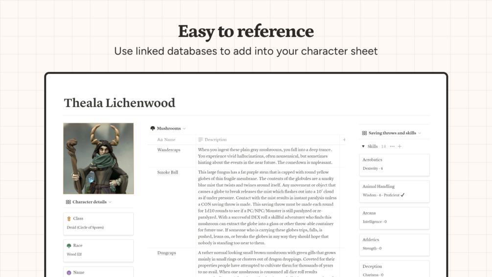 - Easily embed into other Notion pages (i.e. a character sheet) using linked views.