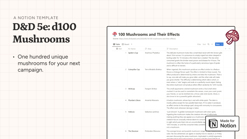 I wanted to use mushrooms in a recent campaign, but couldn't find a solid list online. So I made my own! I got good use out of this list, so I wanted to share it with anyone else that might need it.