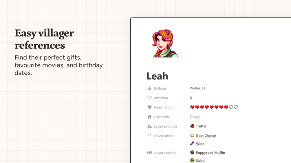 - Easy-to-use references for villagers. Quickly see their favourite gifts, favourite movies, and what your current affection level is with them.