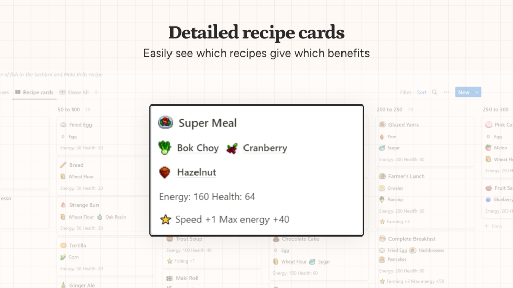 - Views for recipe cards, so you can quickly find meals which give you different bonuses, and which ingredients you need to make them.