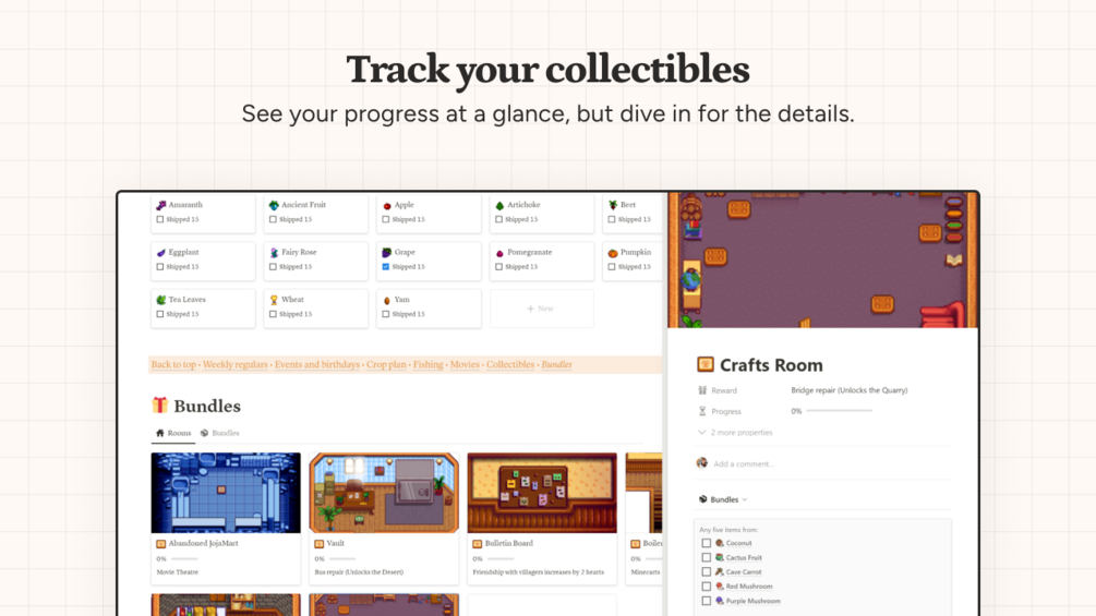 - Databases for the key items and trackables in the game. Includes crops, fish, recipes, bundles, and more.